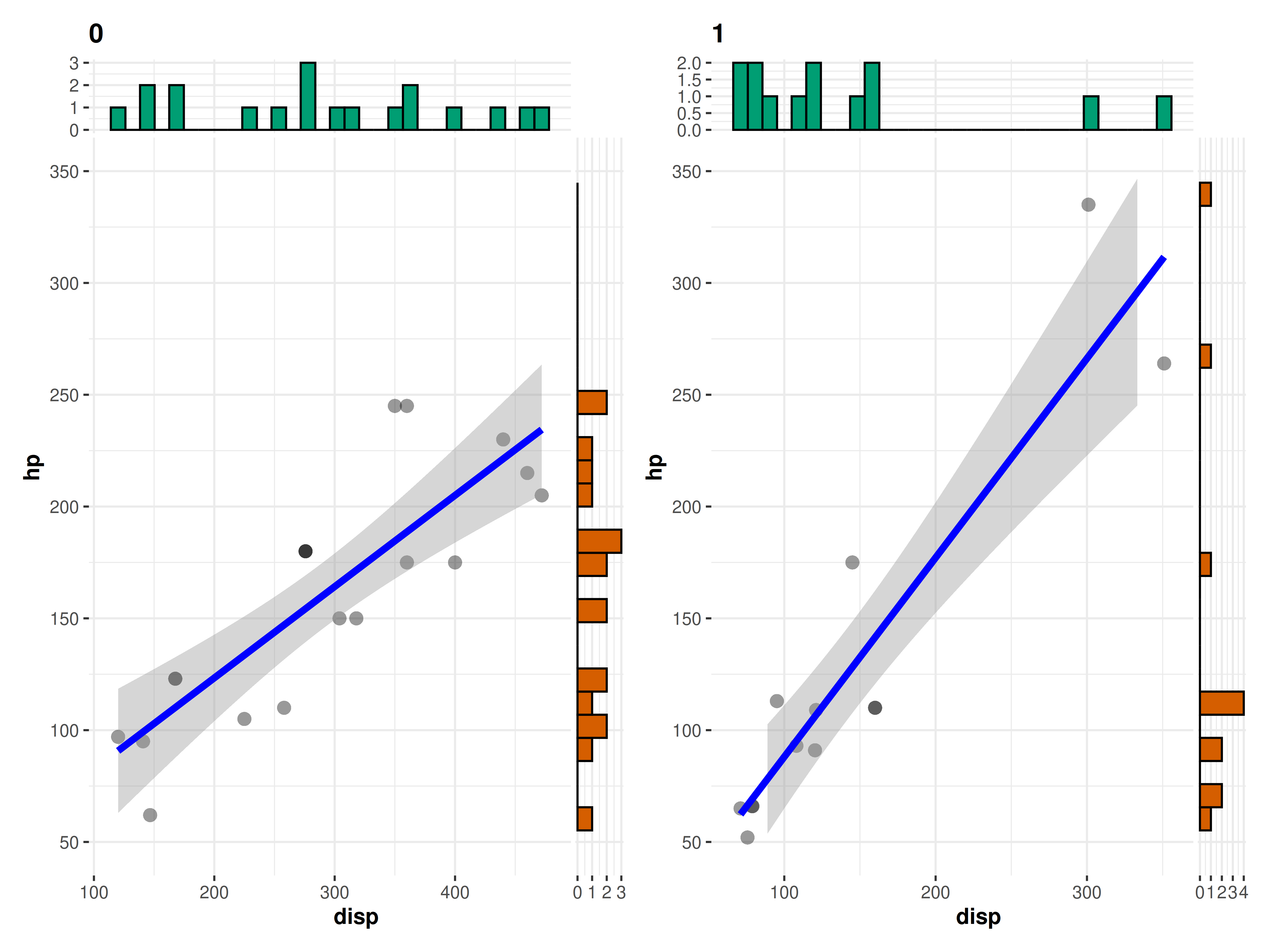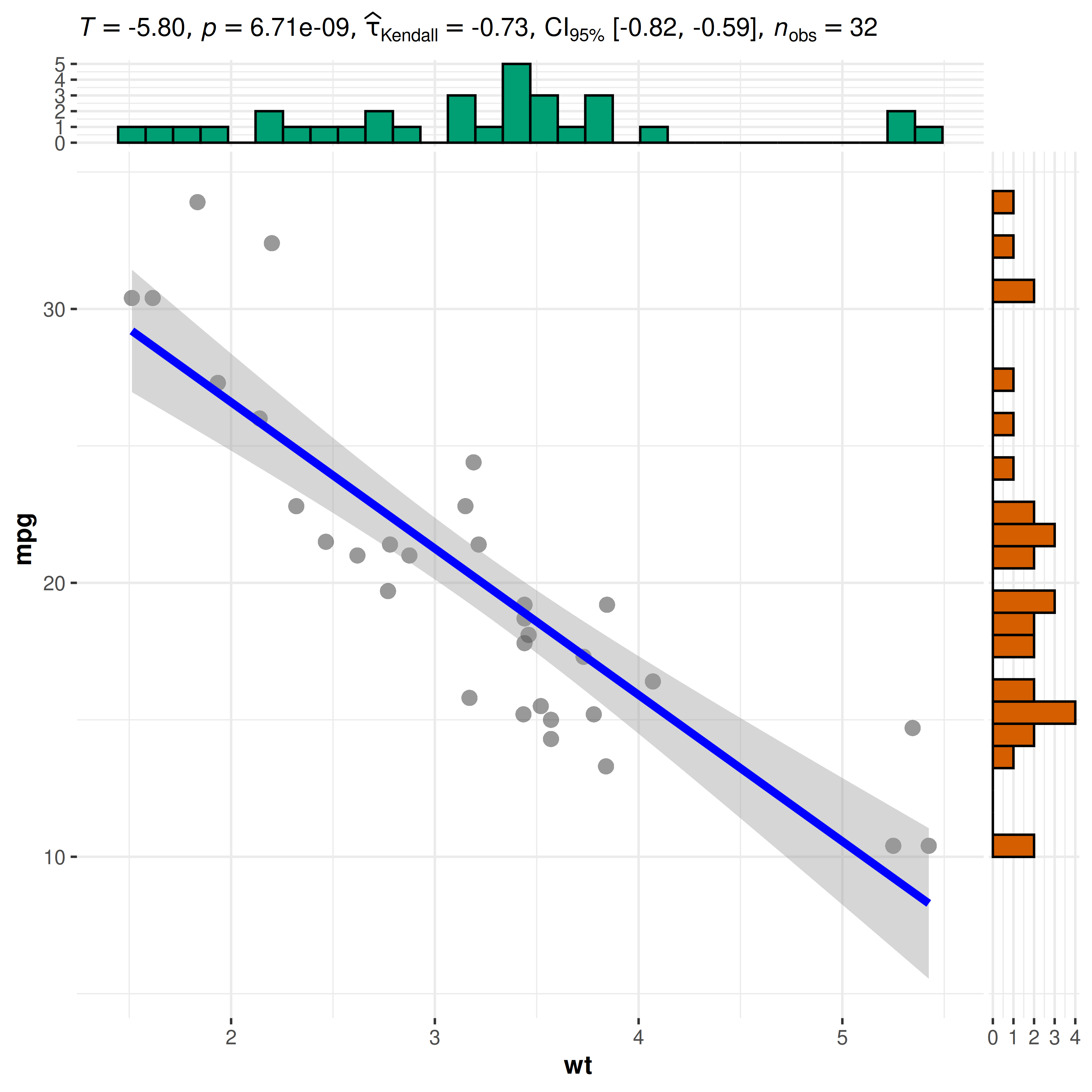 ggscatterstats(df, wt, mpg, results.subtitle = FALSE) +