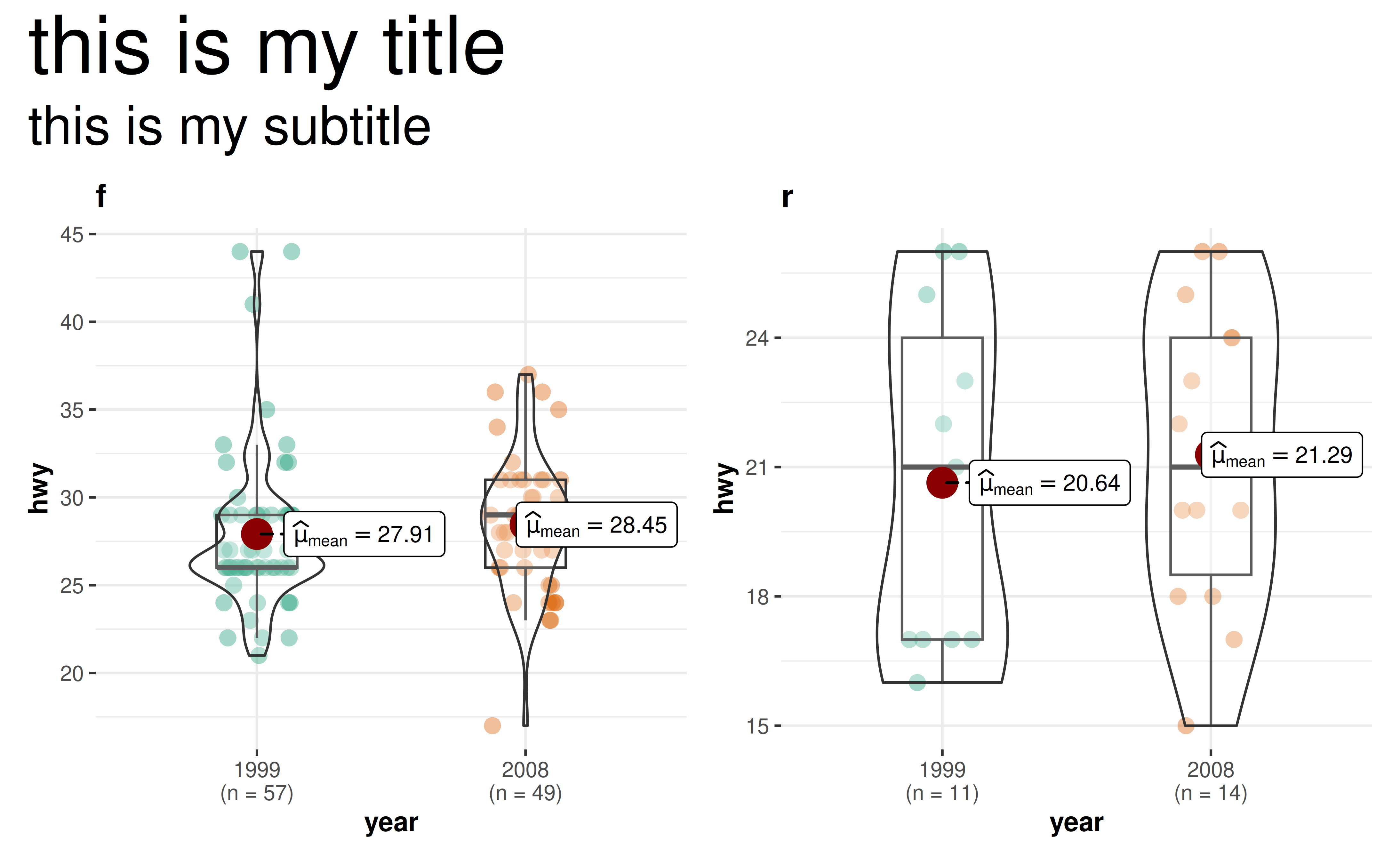Sometimes you may not wish include so many details in the subtitle. In that case, you can extract the expression and copy-paste only the part you wish to include. For example, here only statistic and p-values are included:
