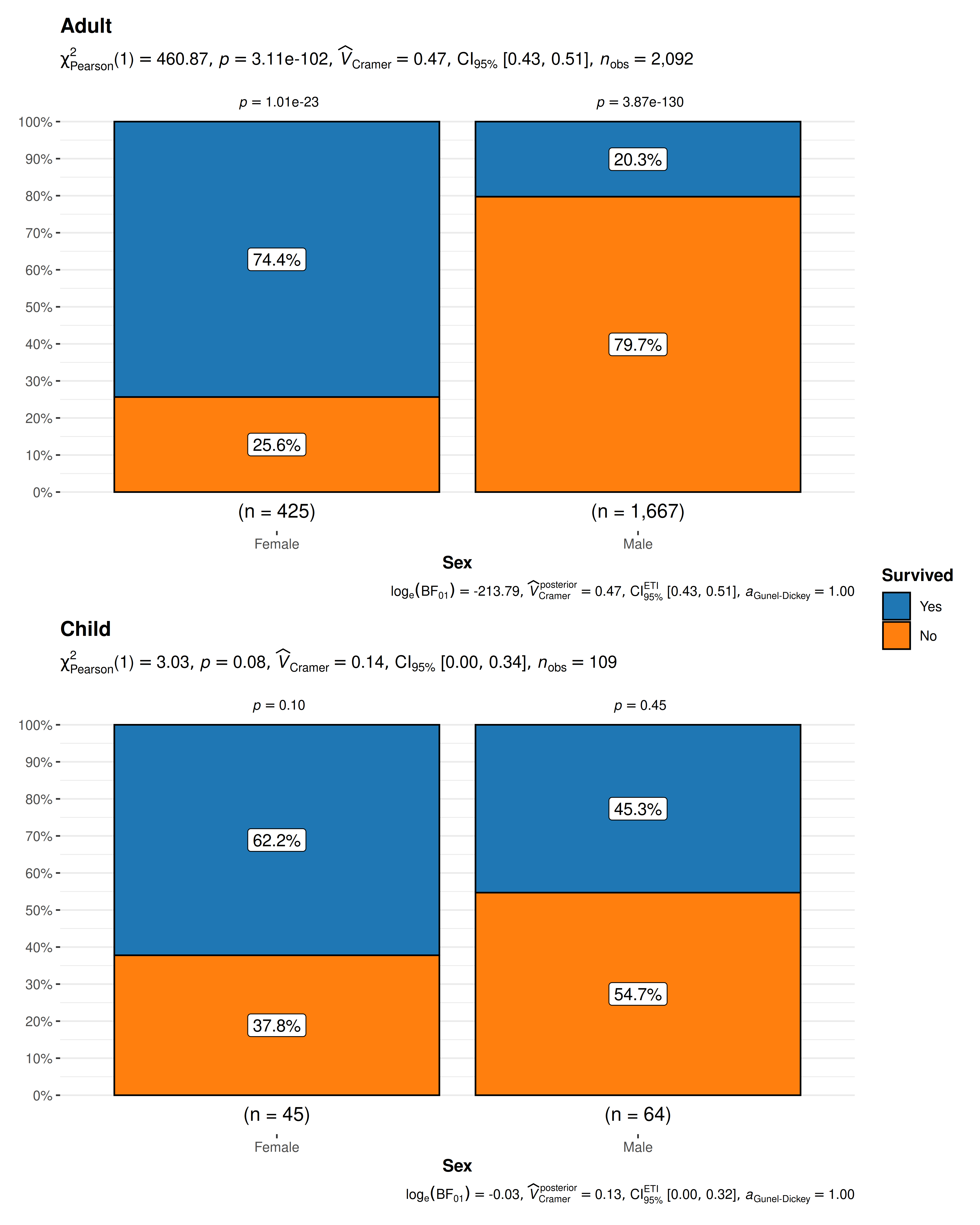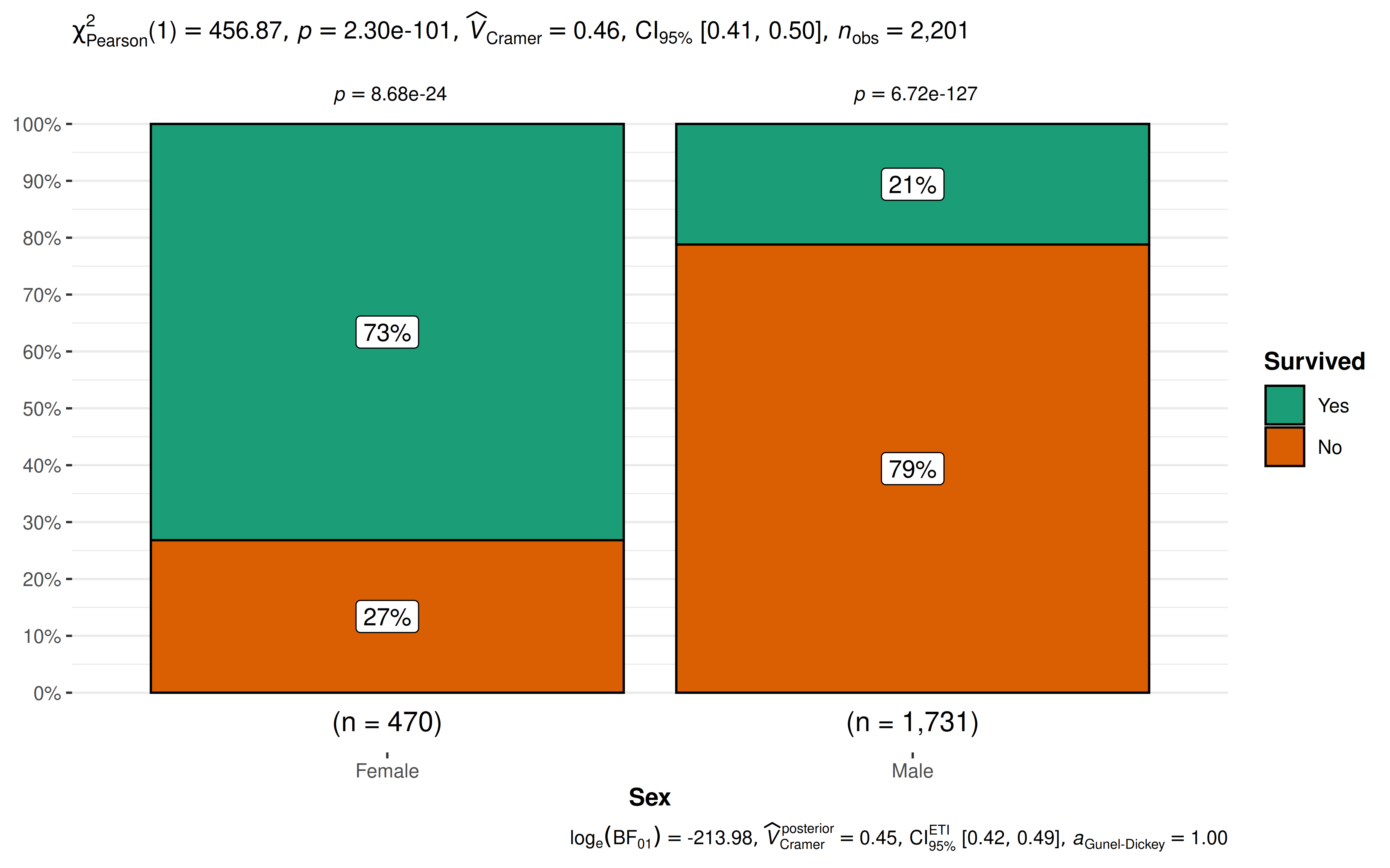 #> $ Survived <fct> No, No, No, No, No, No, No, No, No, No, No, No, No, No, No, N…Independence (or association) with ggbarstats