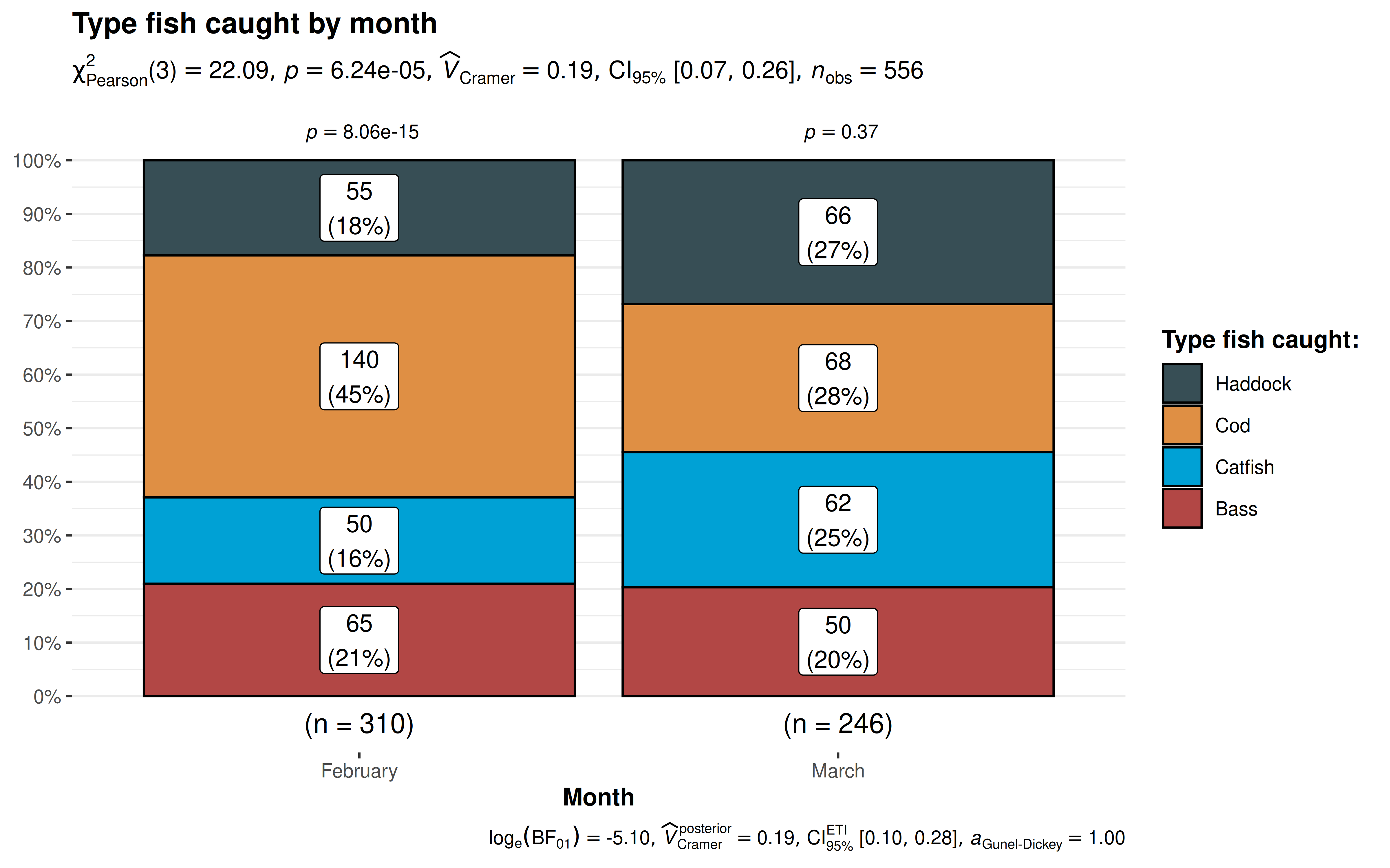 The results support our hypothesis that the type of fish caught is related to the month in which we’re fishing. The independence test results at the top of the plot. In February we catch significantly more Haddock than we would hypothesize for an equal distribution. Whereas in March our results indicate there’s no strong evidence that the distribution isn’t equal.