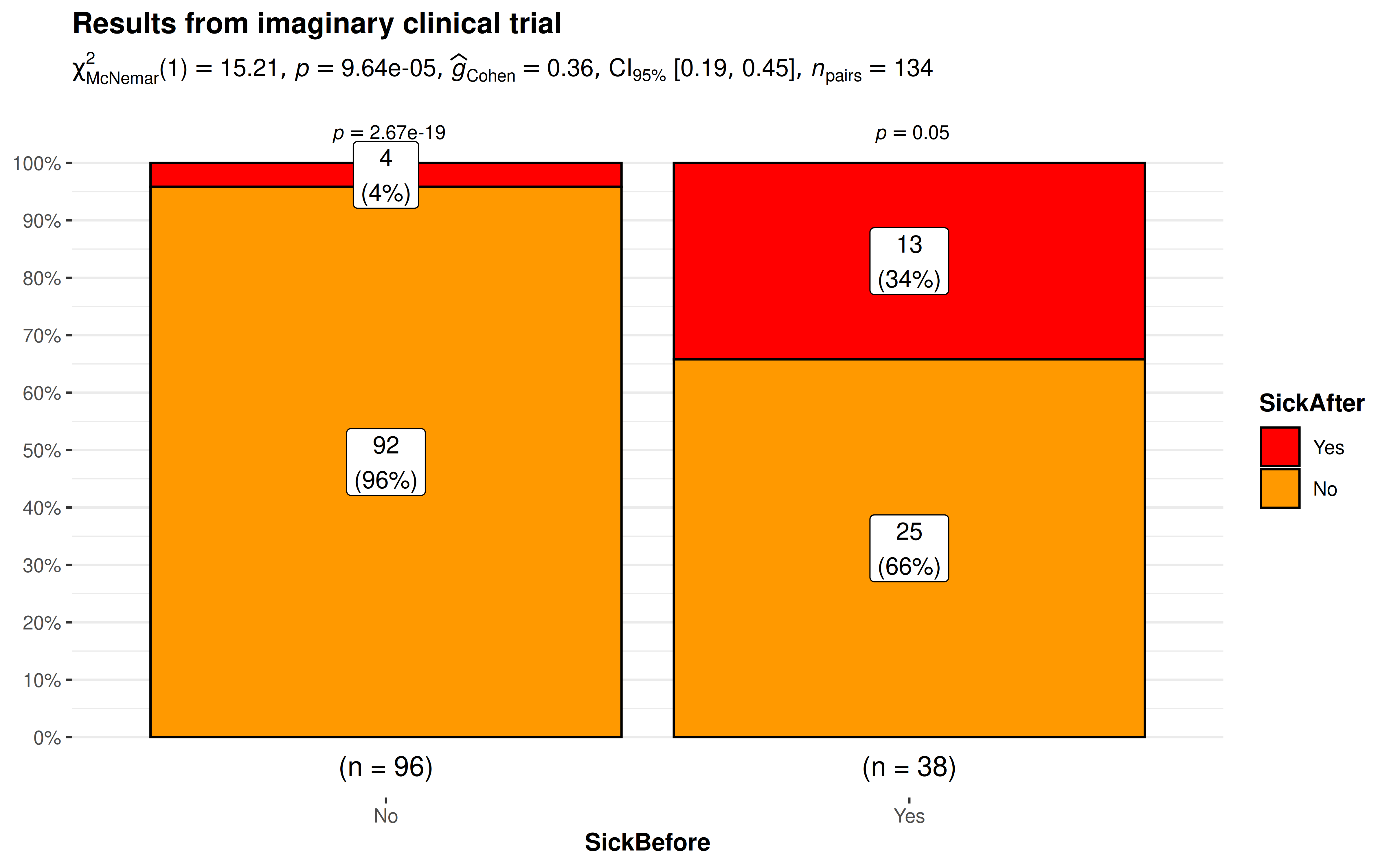 The results bode well for our experimental wonder drug. Of the 96 who started out healthy only 4% were sick after a month. Ideally, we would have hoped for zero but reality is seldom perfect. On the other side of the 38 who started out sick that number has reduced to just 13 or 34% which is a marked improvement.
