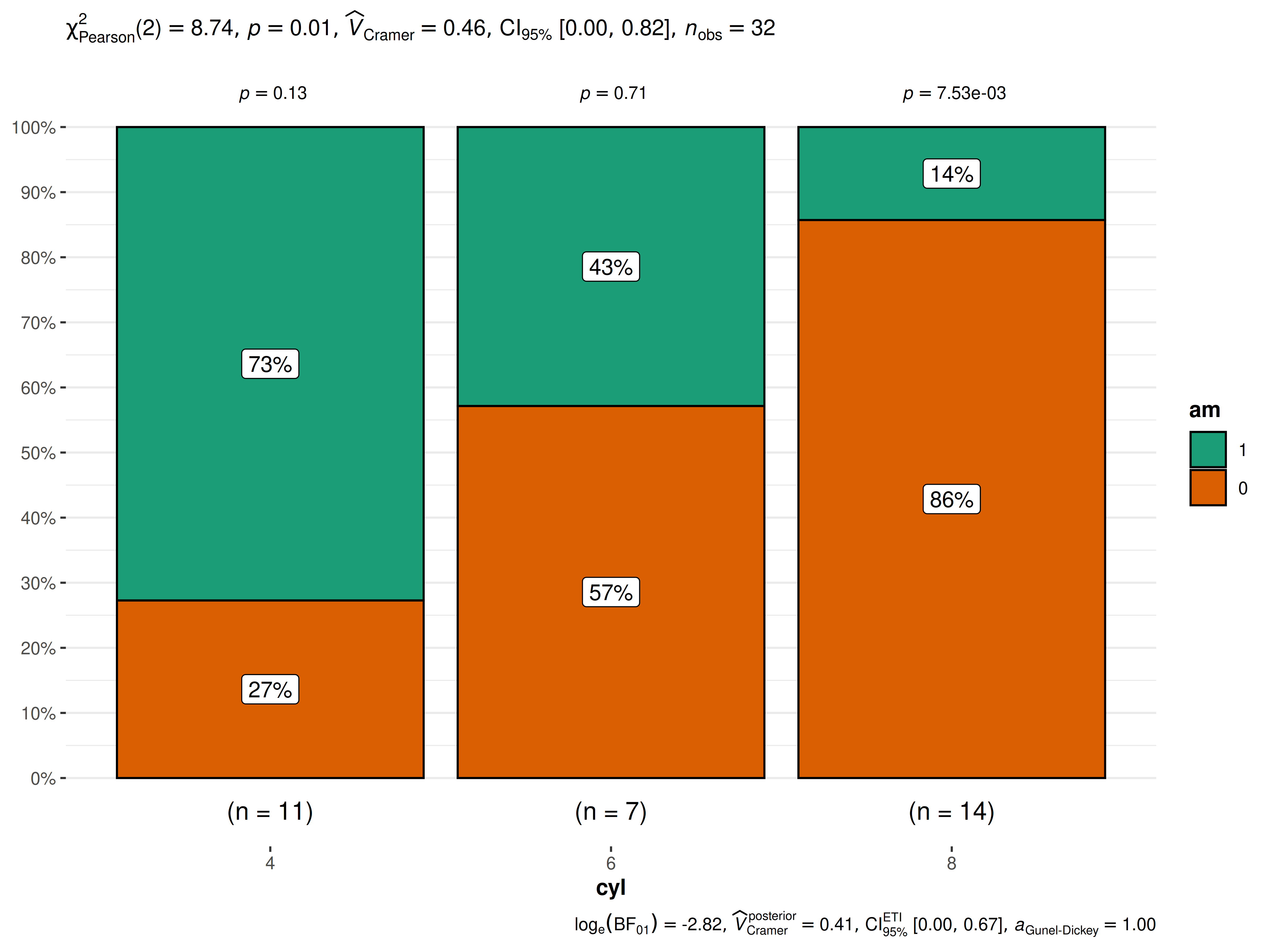 Pearson’s -test of independence revealed that, across 32 automobiles, showed that there was a significant association between transmission engine and number of cylinders. The Bayes Factor for the same analysis revealed that the data were 16.78 times more probable under the alternative hypothesis as compared to the null hypothesis. This can be considered strong evidence (Jeffreys, 1961) in favor of the alternative hypothesis.