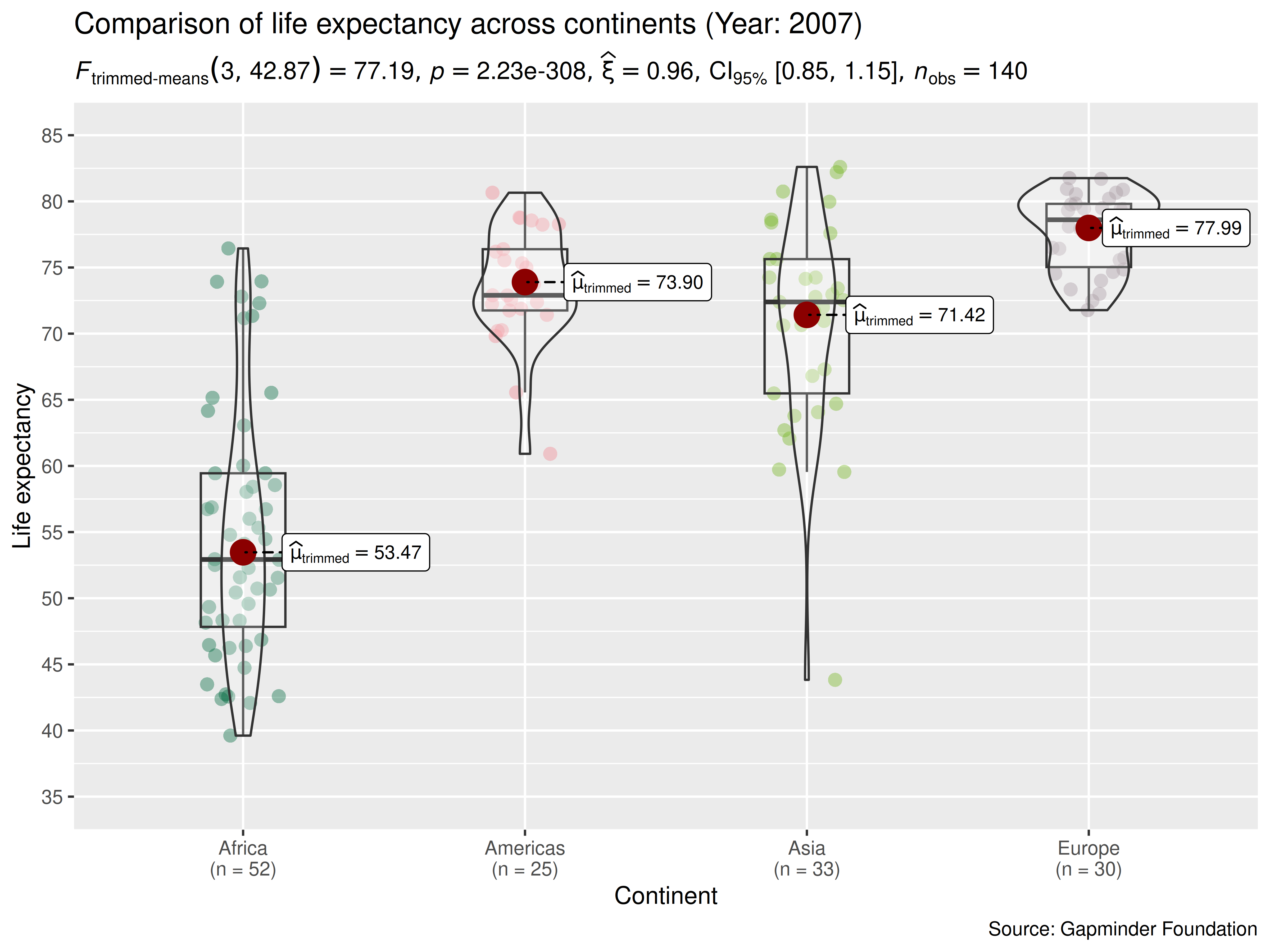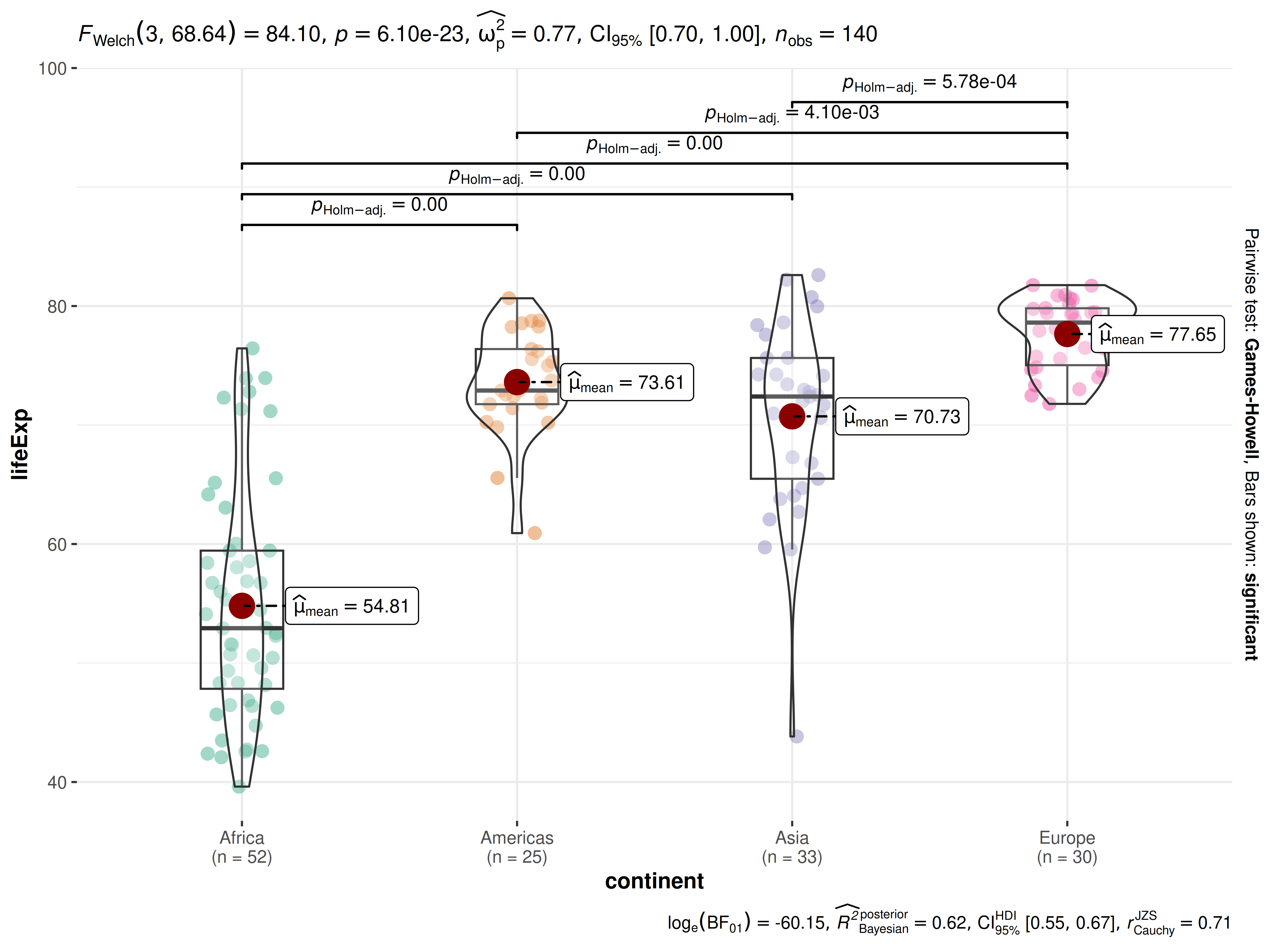As can be appreciated from the effect size (partial eta squared) of 0.635, there are large differences in the mean life expectancy across continents. Importantly, this plot also helps us appreciate the distributions within any given continent. For example, although Asian countries are doing much better than African countries, on average, Afghanistan has a particularly grim average for the Asian continent, possibly reflecting the war and the political turmoil.