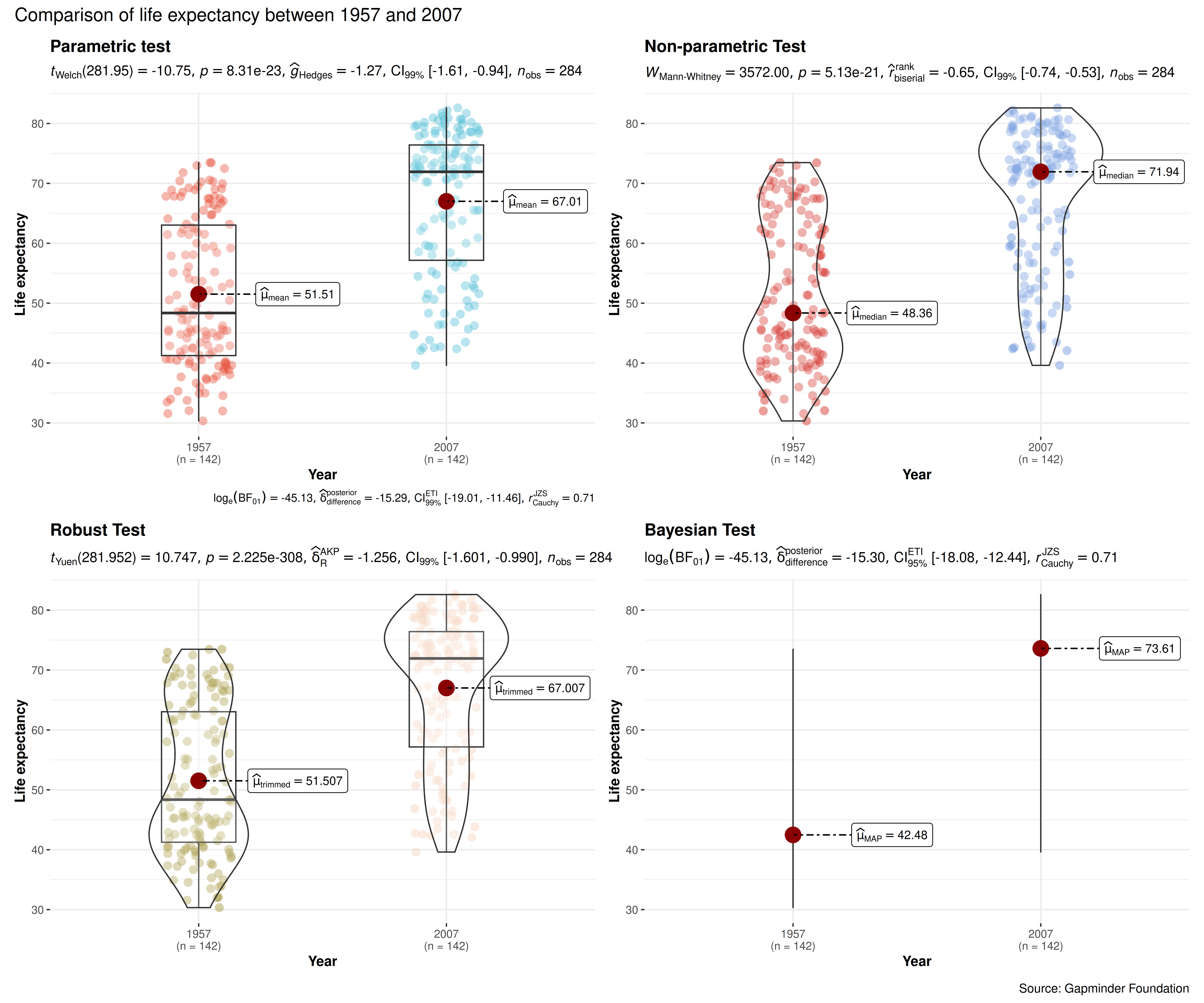 So far we have only used a classic parametric test and a boxviolin plot, but we can also use other available options: