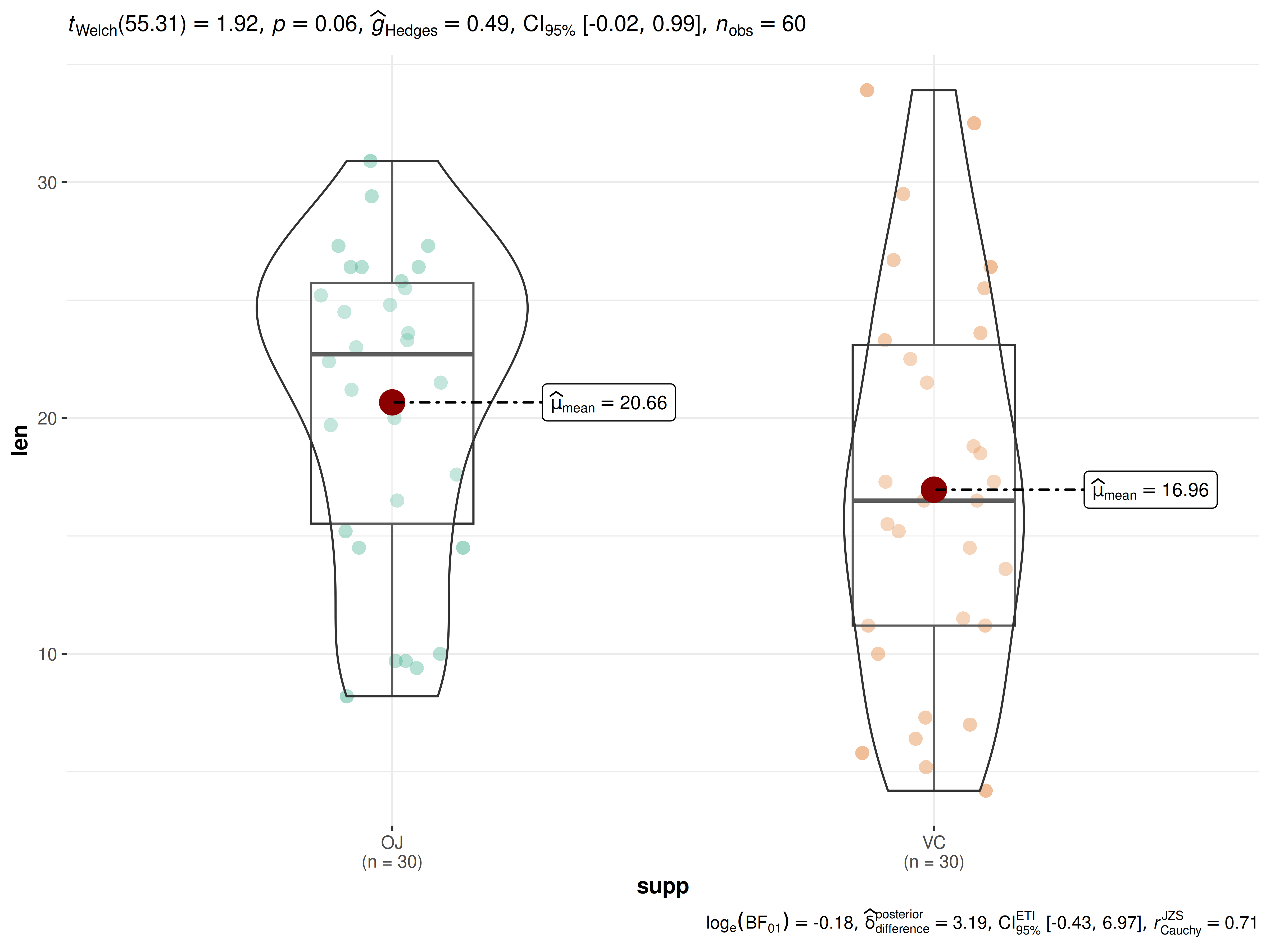 Welch’s t-test revealed that, across 60 guinea pigs, although the tooth length was higher when the animal received vitamin C via orange juice as compared to via ascorbic acid, this effect was not statistically significant. The effect size was medium, as per Cohen’s (1988) conventions. The Bayes Factor for the same analysis revealed that the data were 1.2 times more probable under the alternative hypothesis as compared to the null hypothesis. This can be considered weak evidence (Jeffreys, 1961) in favor of the alternative hypothesis.