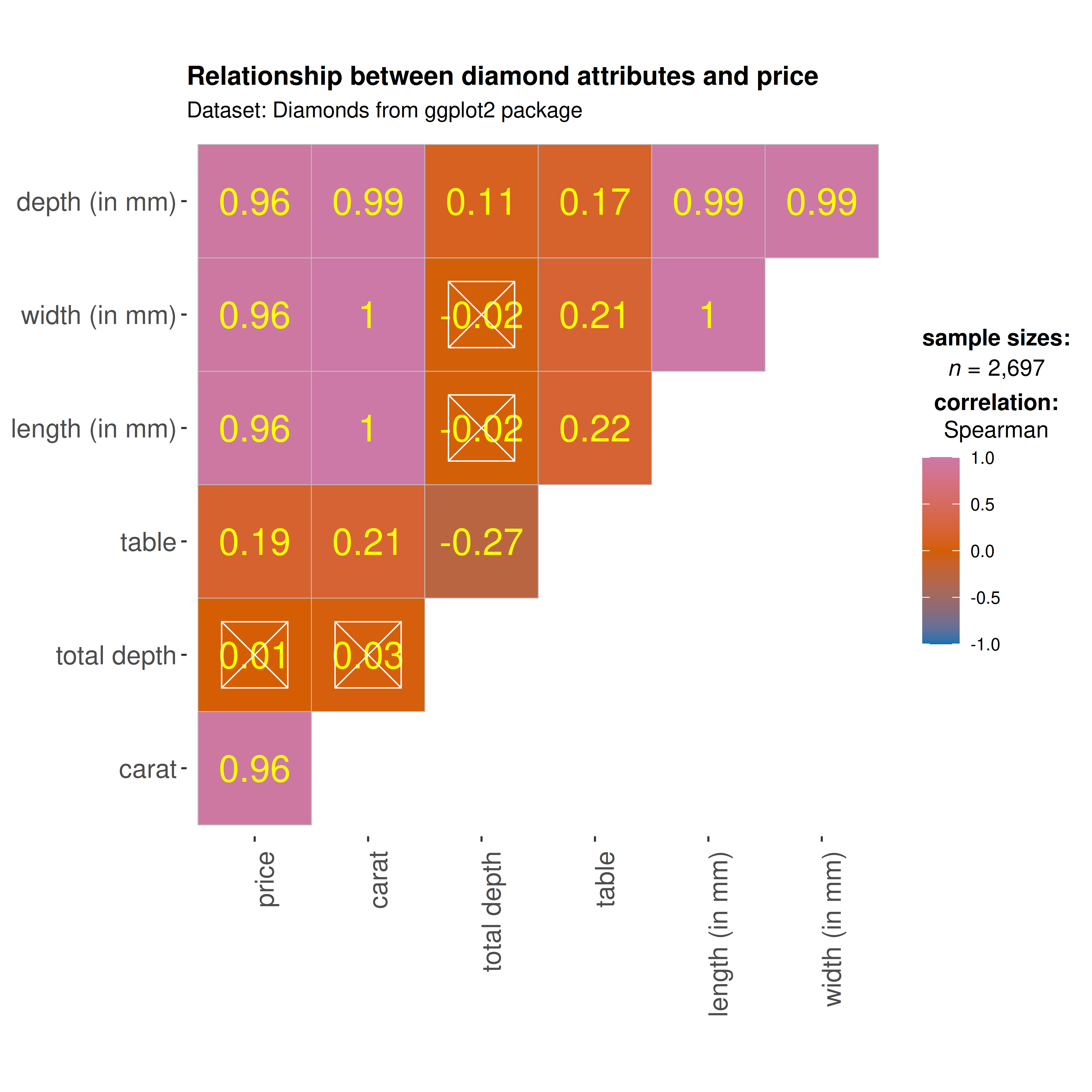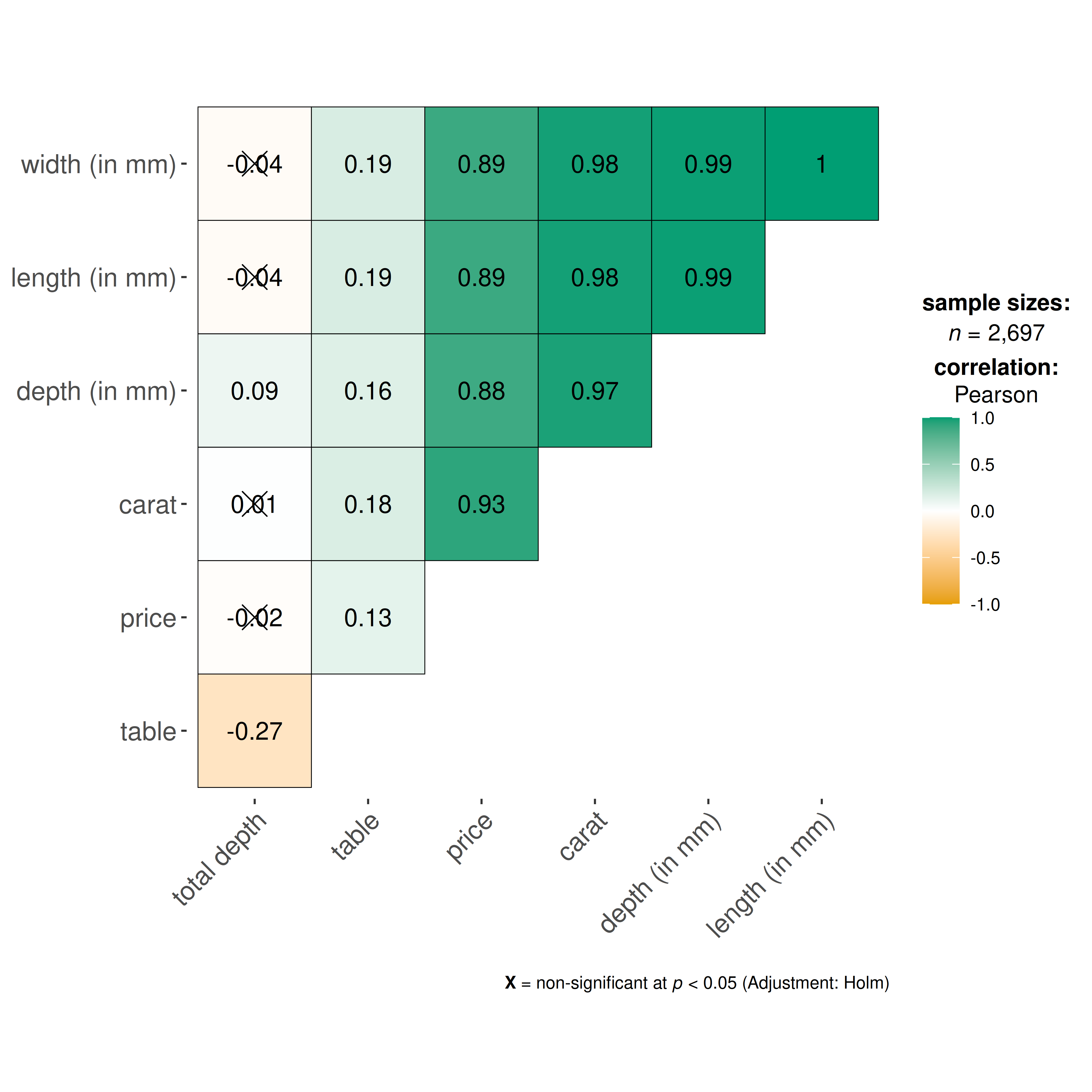 cor.vars = c(carat, depth:z), ## note how the variables are getting selected