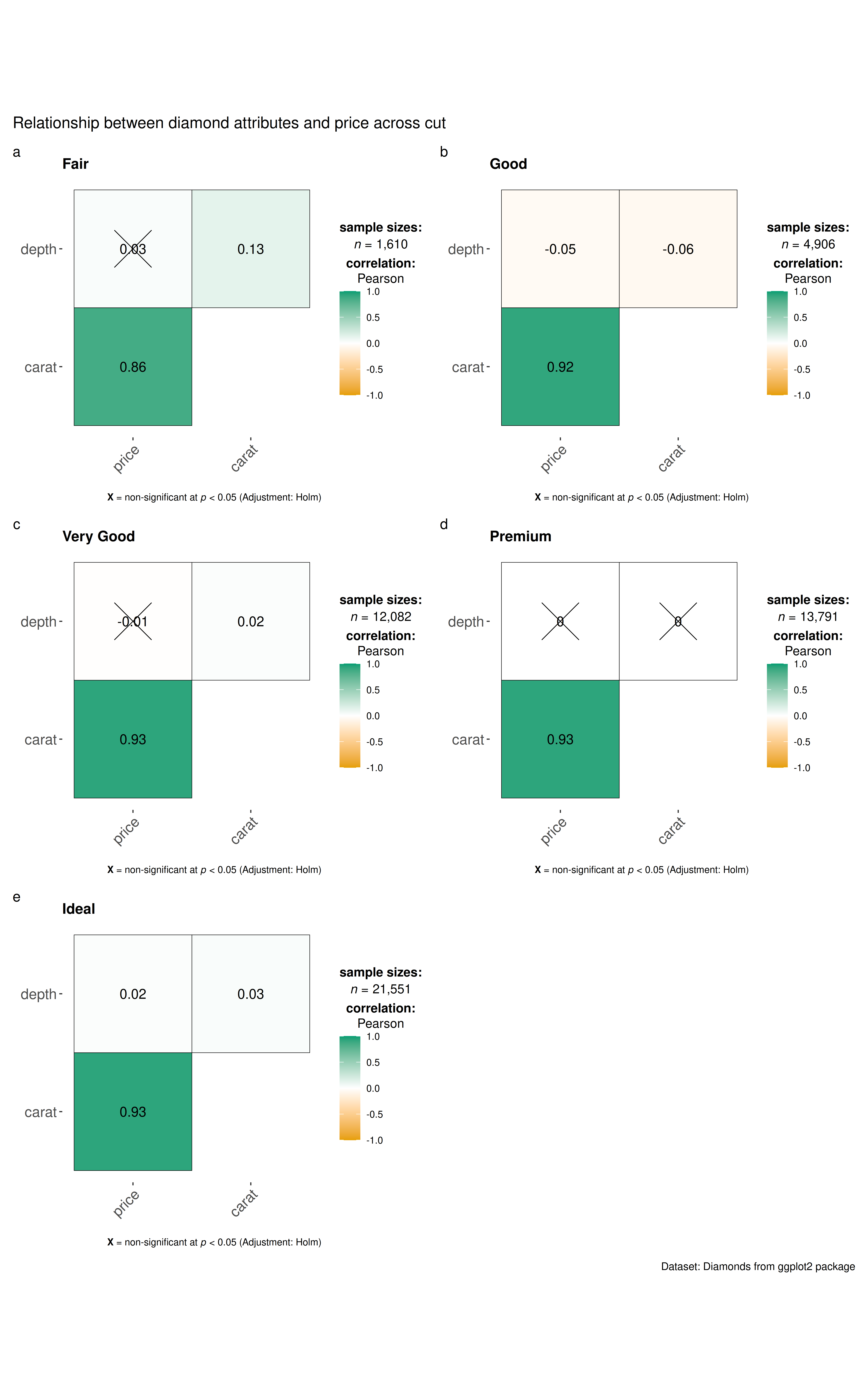 cor.vars = c(price, carat, depth),