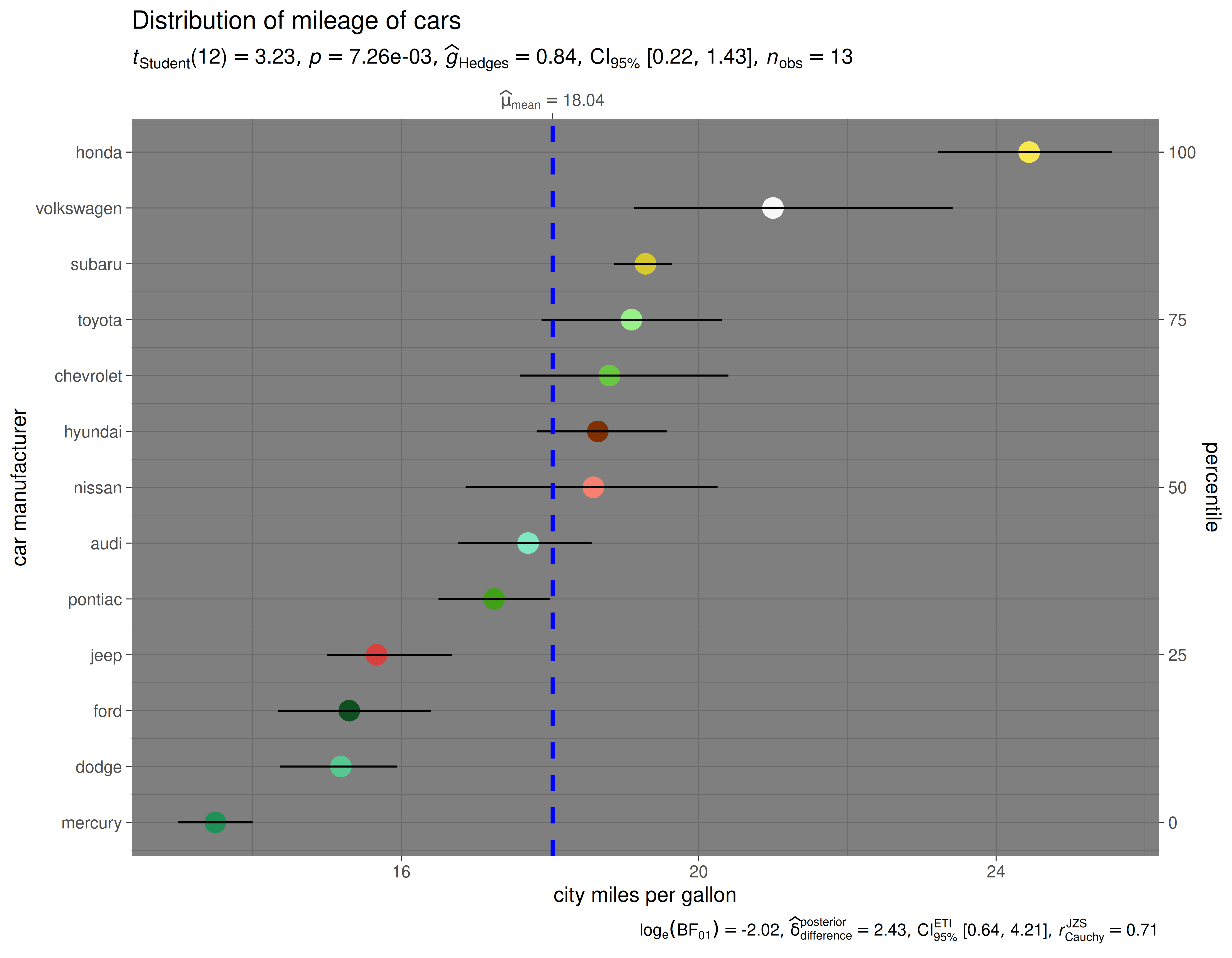 #> $ class <chr> "compact", "compact", "compact", "compact", "compact", "c…Let’s say we want to visualize the distribution of mileage by car manufacturer.