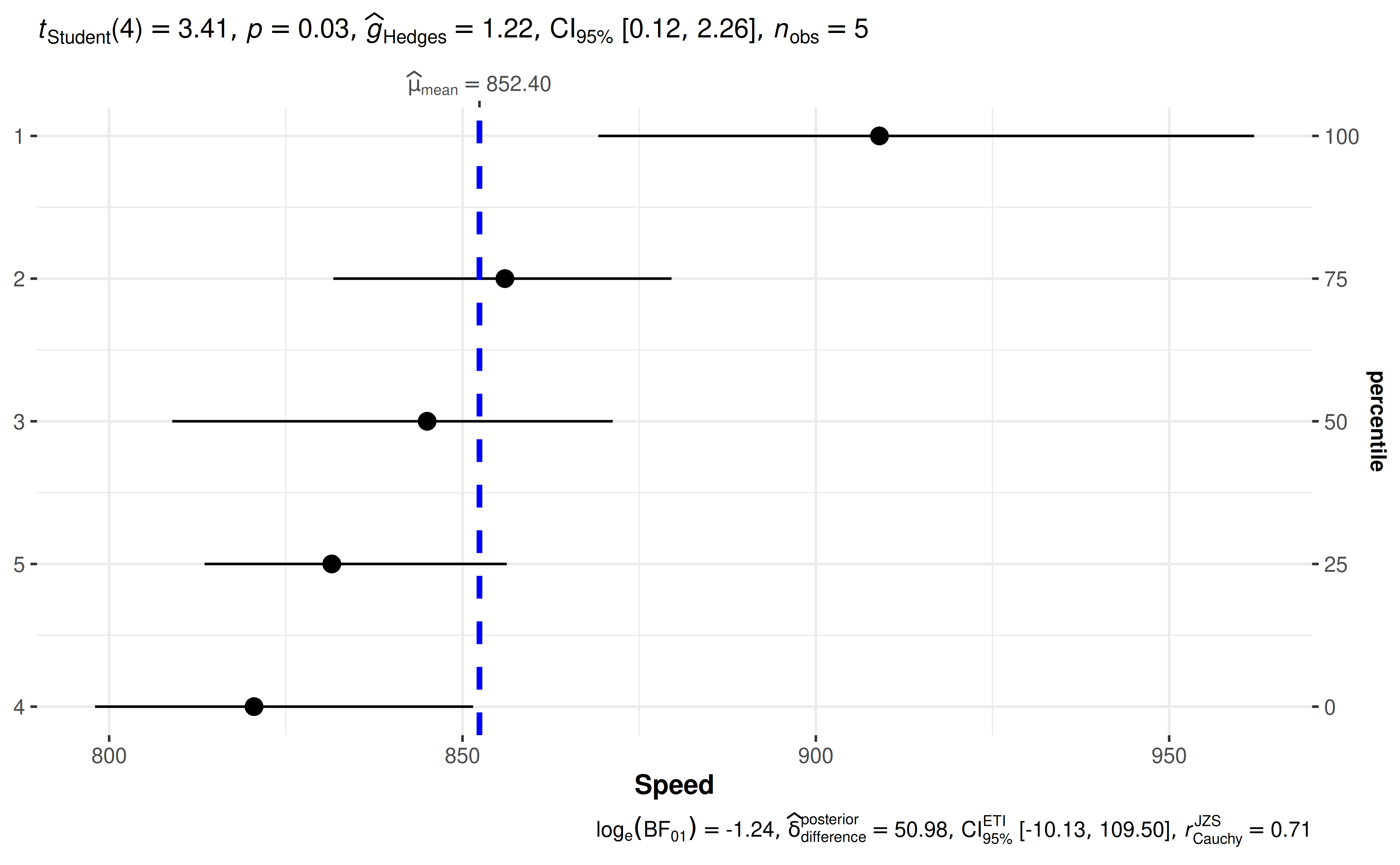 ggdotplotstats(morley, Speed, Expt, test.value = 800)