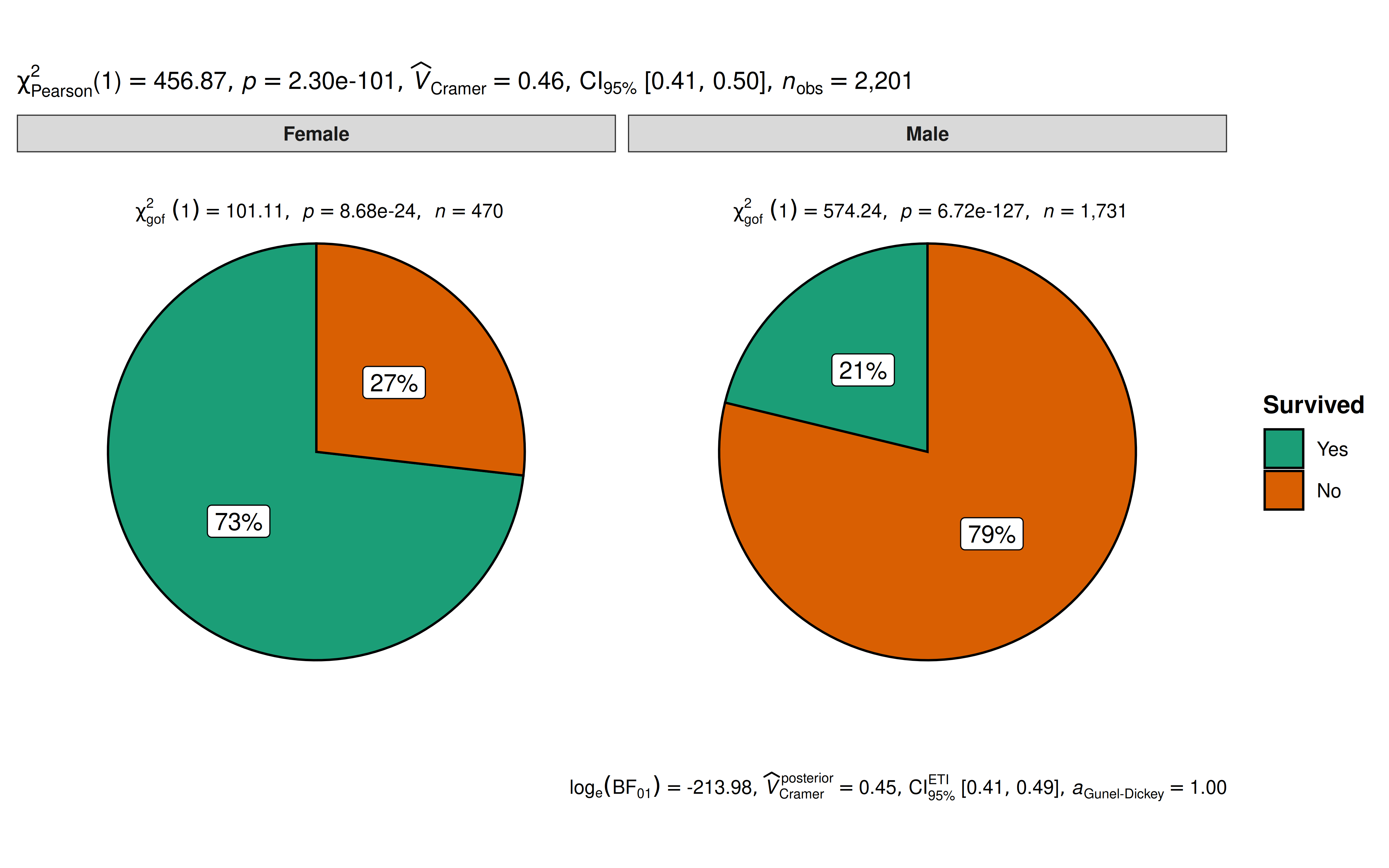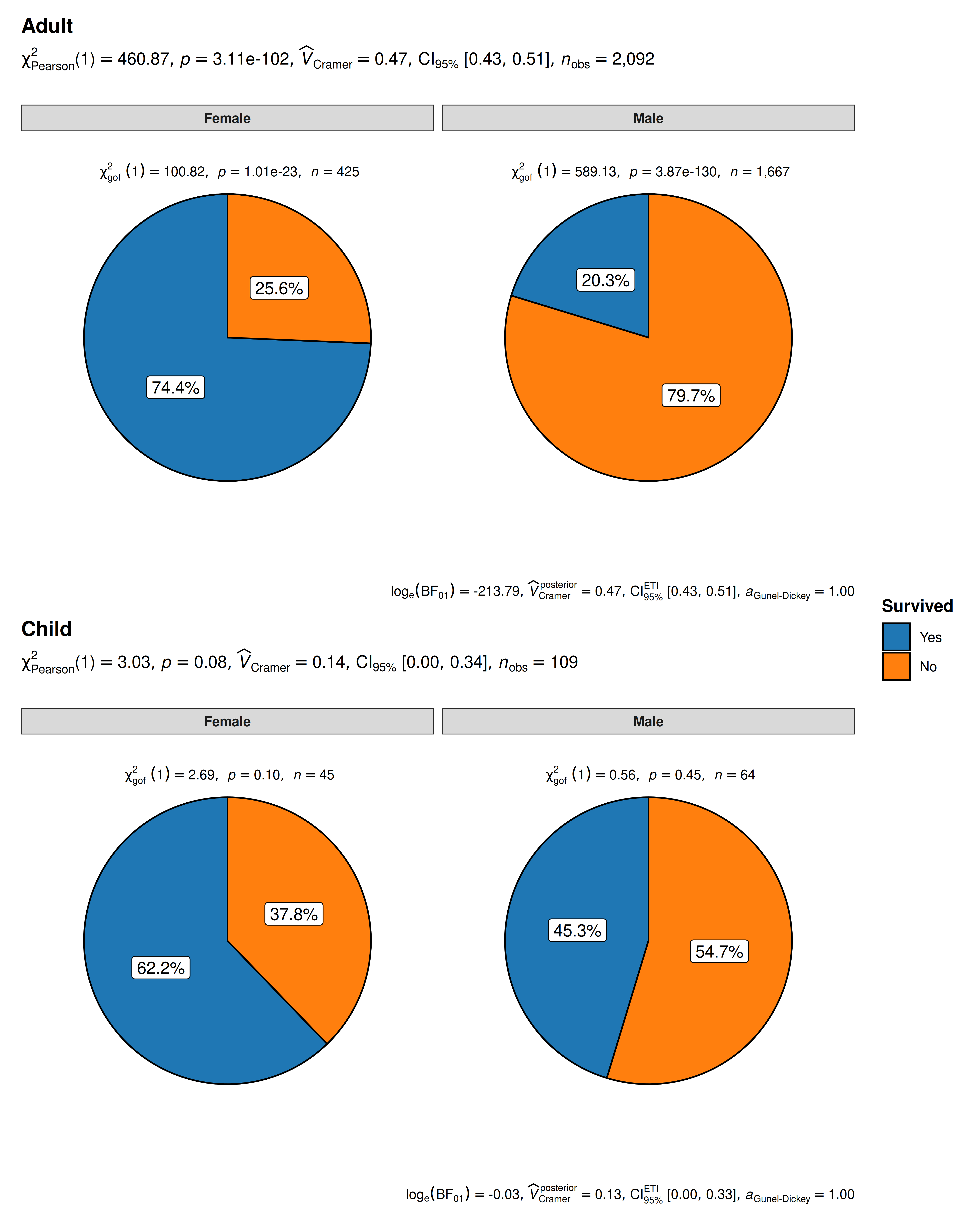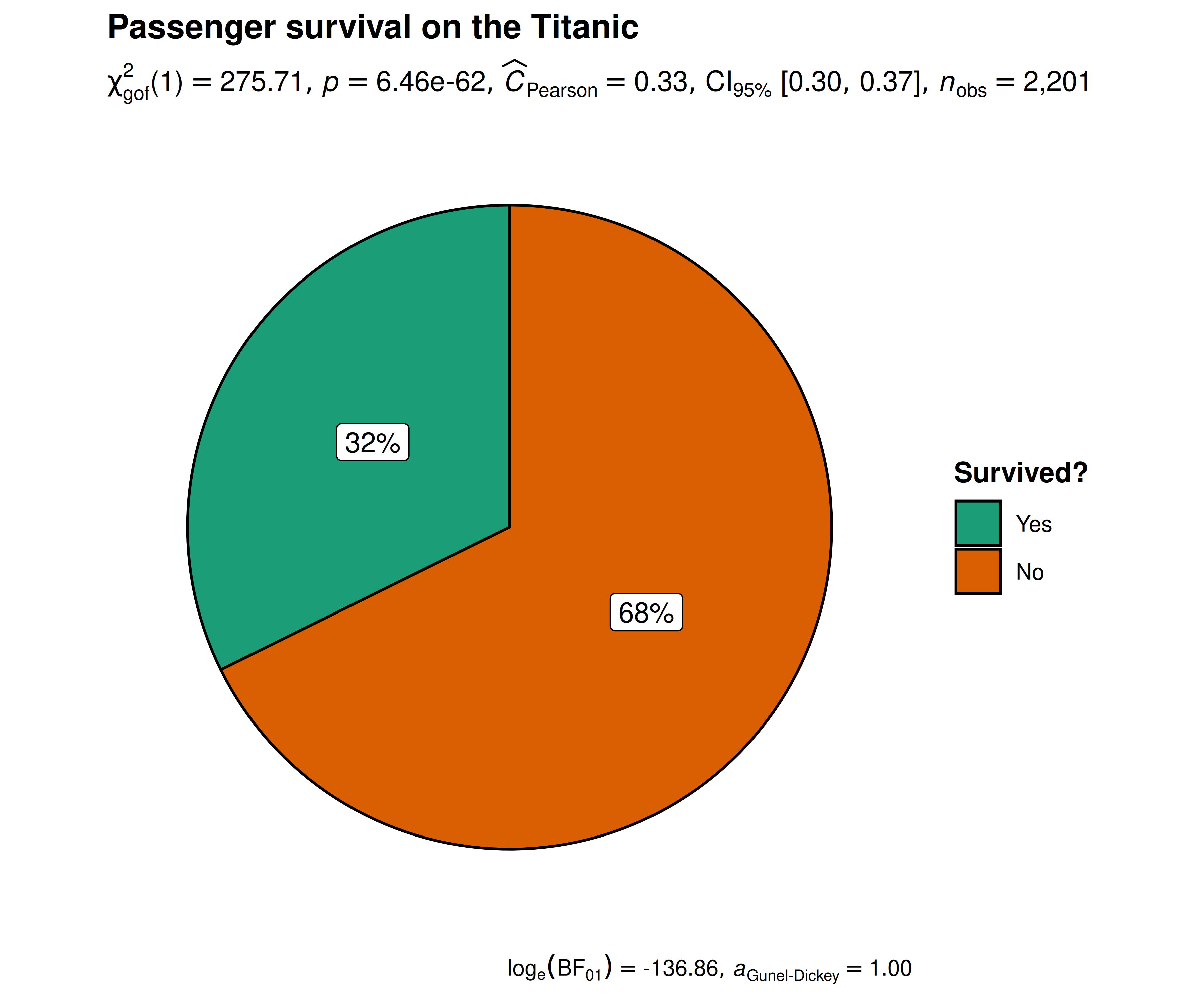 #> $ Survived <fct> No, No, No, No, No, No, No, No, No, No, No, No, No, No, No, N…Goodness of Fit with ggpiestats