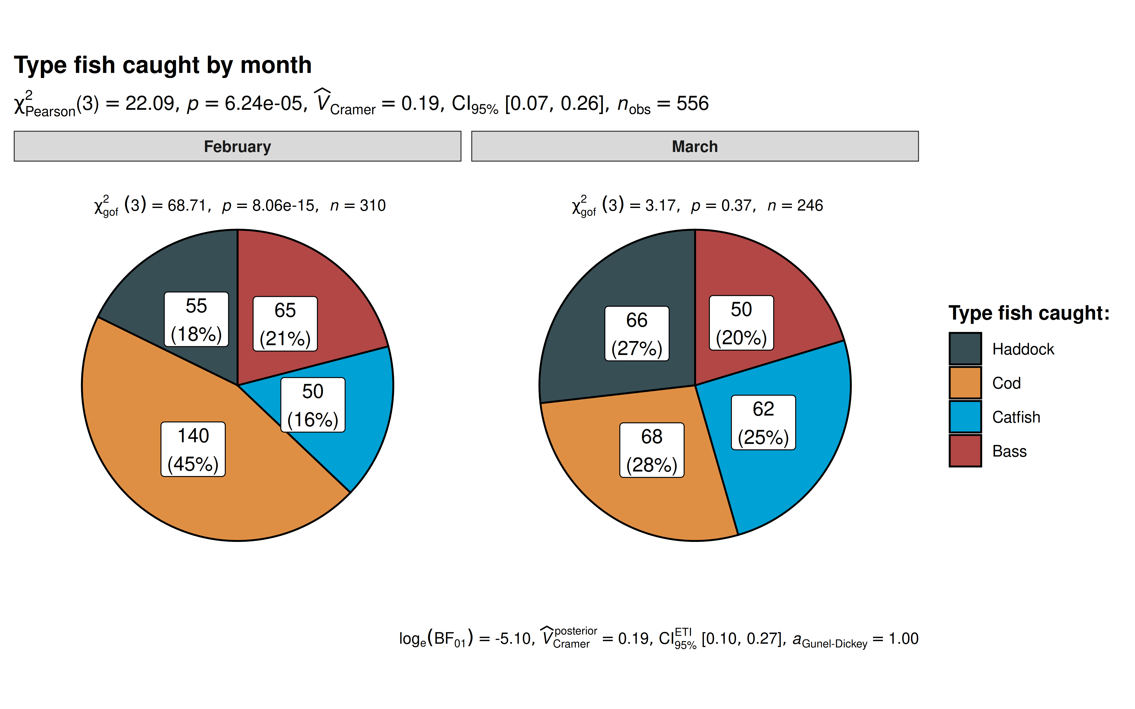 The results support our hypothesis that the type of fish caught is related to the month in which we’re fishing. The independence test results at the top of the plot. In February, we catch significantly more Cod than we would hypothesize for an equal distribution. Whereas, in March, our results indicate there’s no strong evidence that the distribution isn’t equal.
