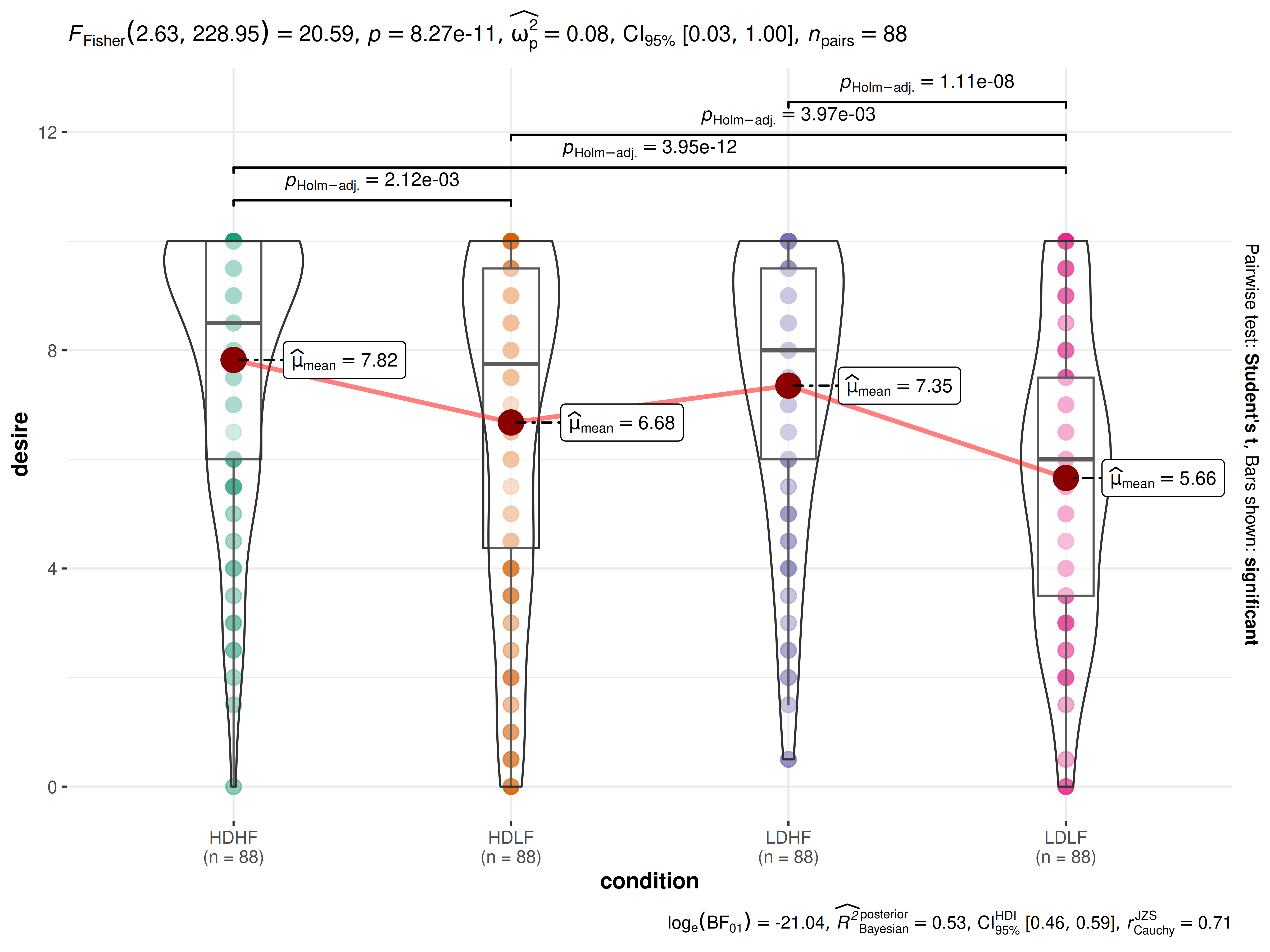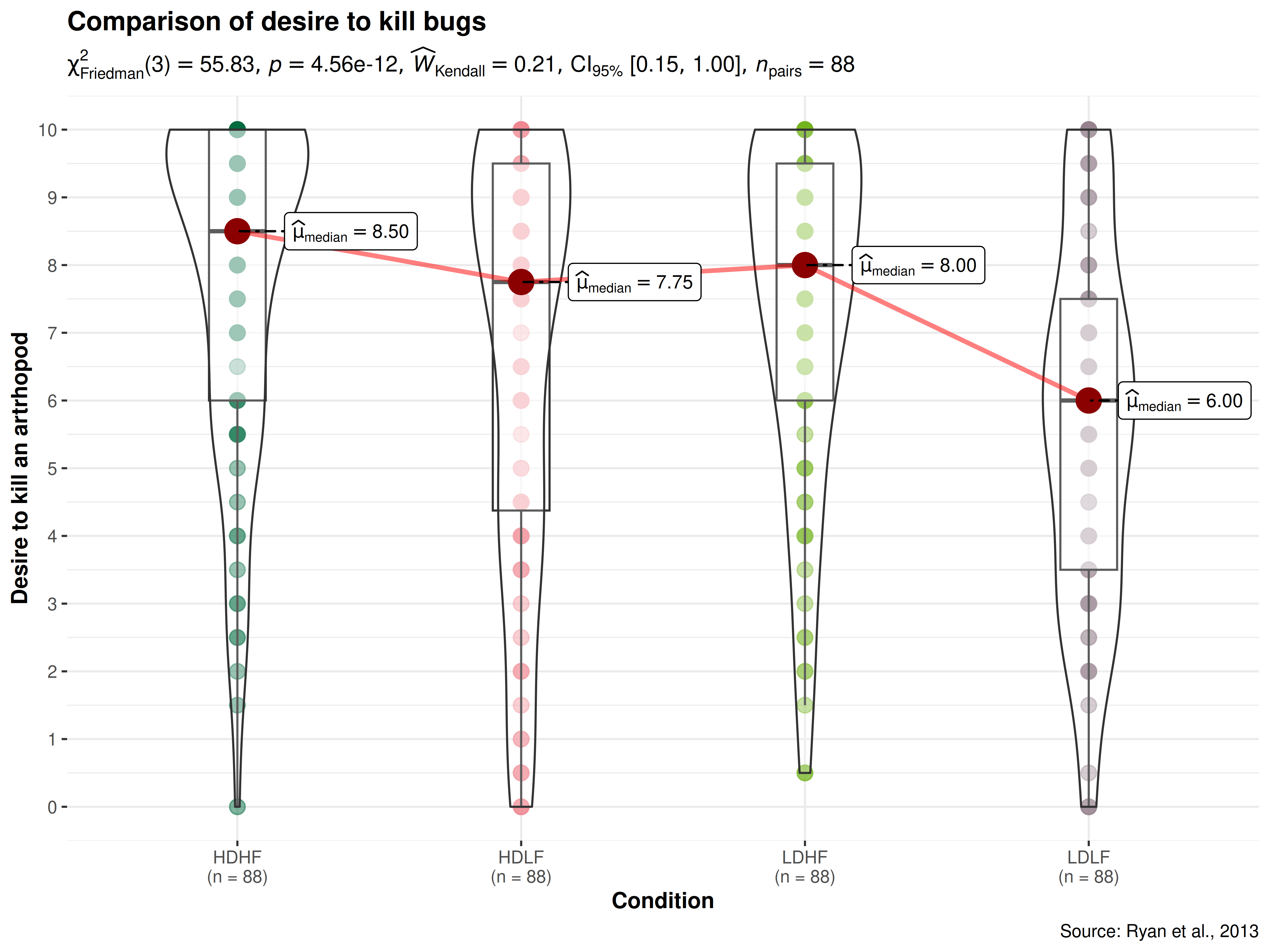 As can be appreciated from the effect size (partial eta squared) of 0.18, there are small differences in the mean desire to kill across conditions. Importantly, this plot also helps us appreciate the distributions within any given condition.