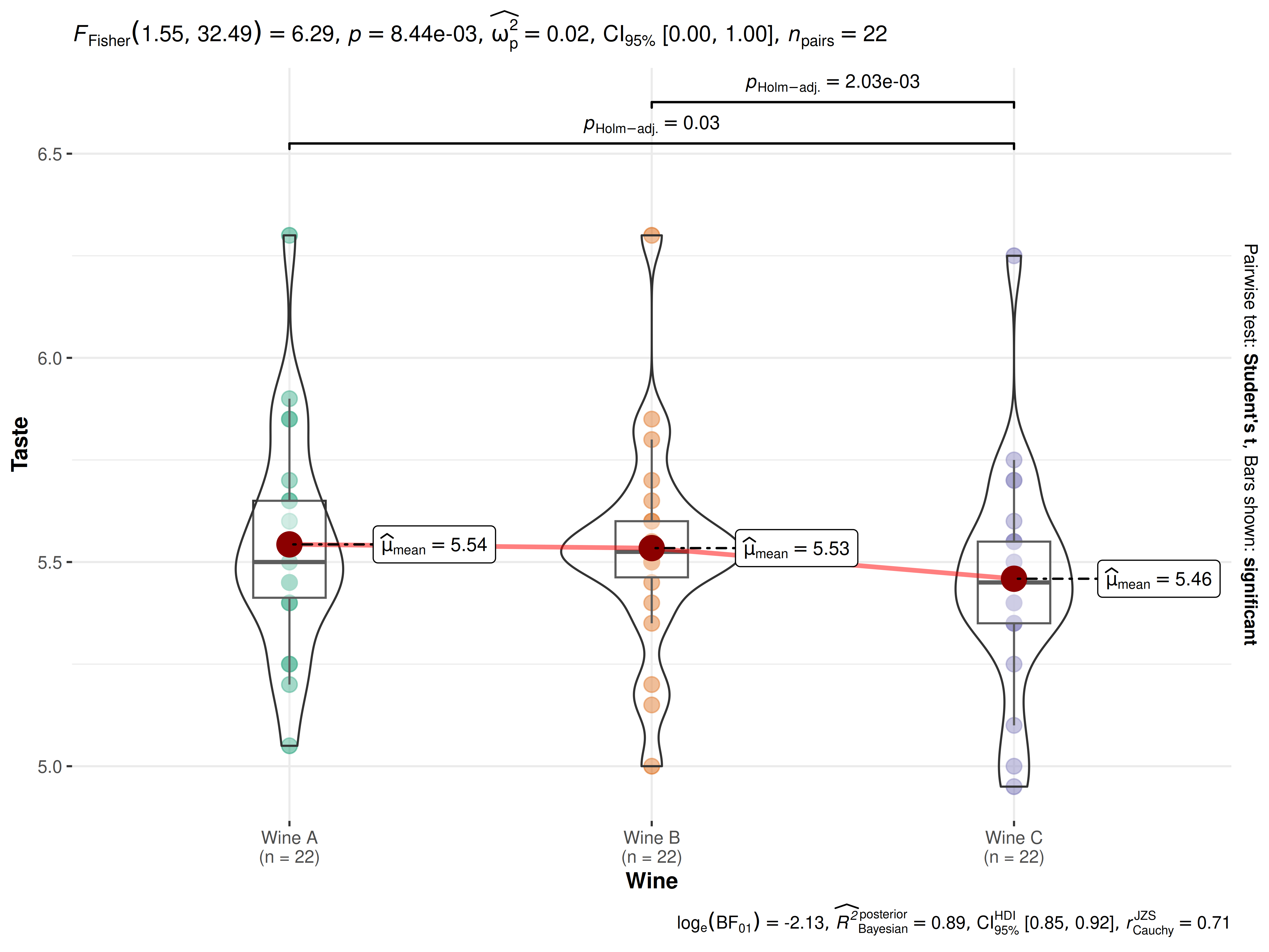Fisher’s repeated measures one-way ANOVA revealed that, across 22 friends to taste each of the three wines, there was a statistically significant difference across persons preference for each wine. The effect size was medium, as per Field’s (2013) conventions. The Bayes Factor for the same analysis revealed that the data were 8.25 times more probable under the alternative hypothesis as compared to the null hypothesis. This can be considered moderate evidence (Jeffreys, 1961) in favor of the alternative hypothesis. This global effect was carried out by post hoc pairwise t-tests, which revealed that Wine C was preferred across participants to be the least desirable compared to Wines A and B.