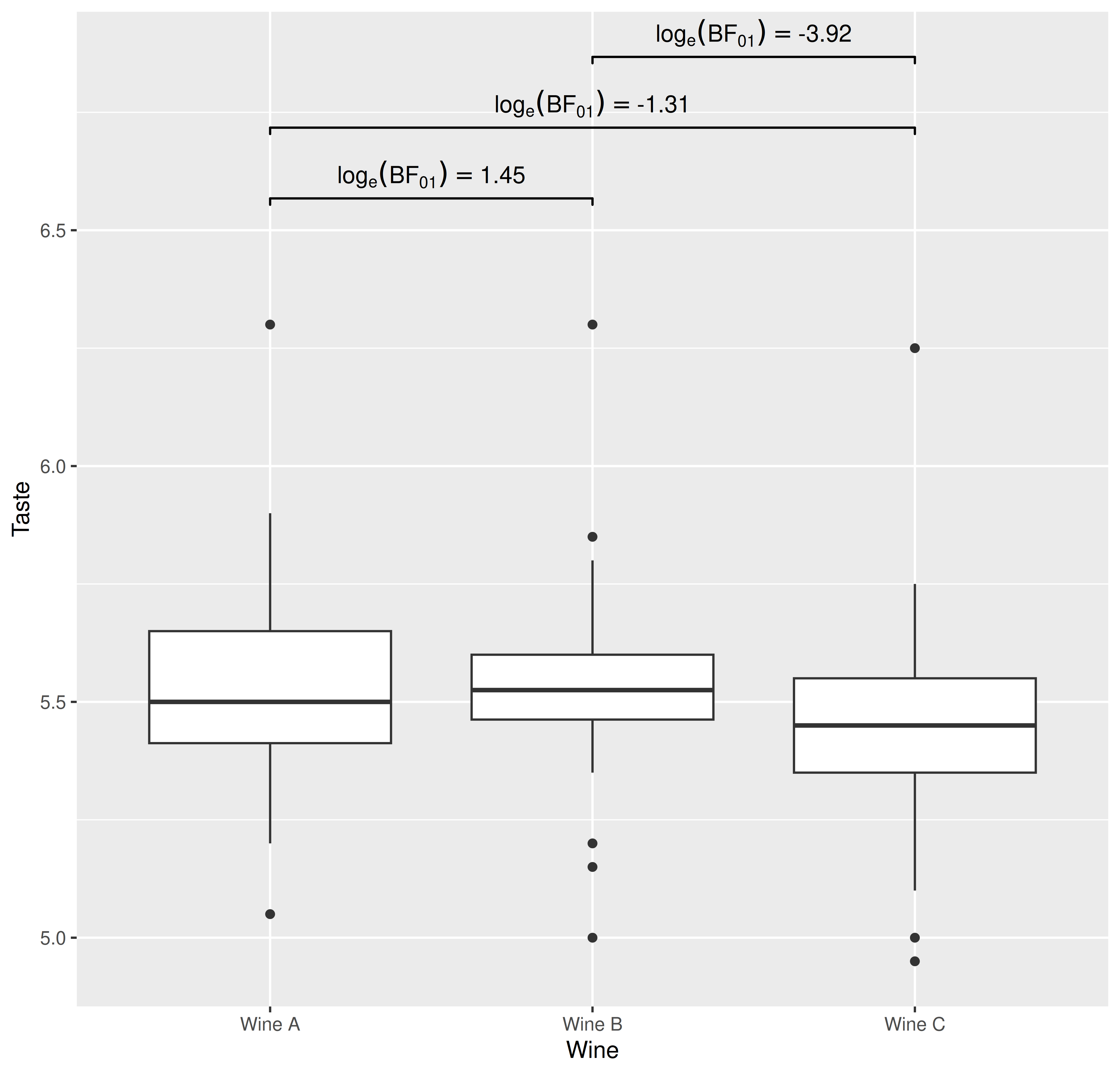 #> 3 Wine B Wine C Difference Bayesian t-test 0.0693 0.95 0.0303