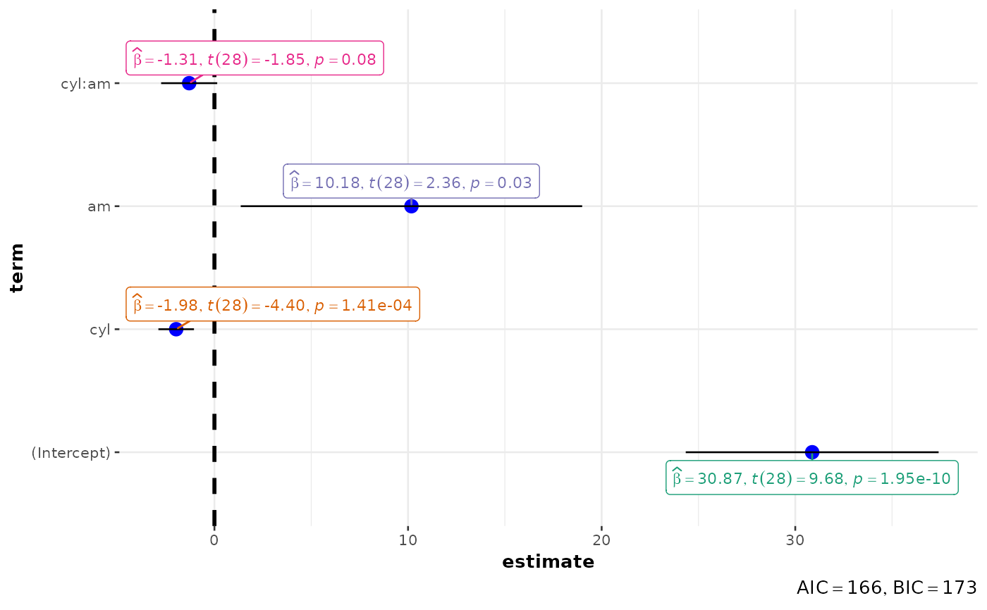 Plot with the regression coefficients' point estimates as dots with confidence interval whiskers and other statistical details included as labels.