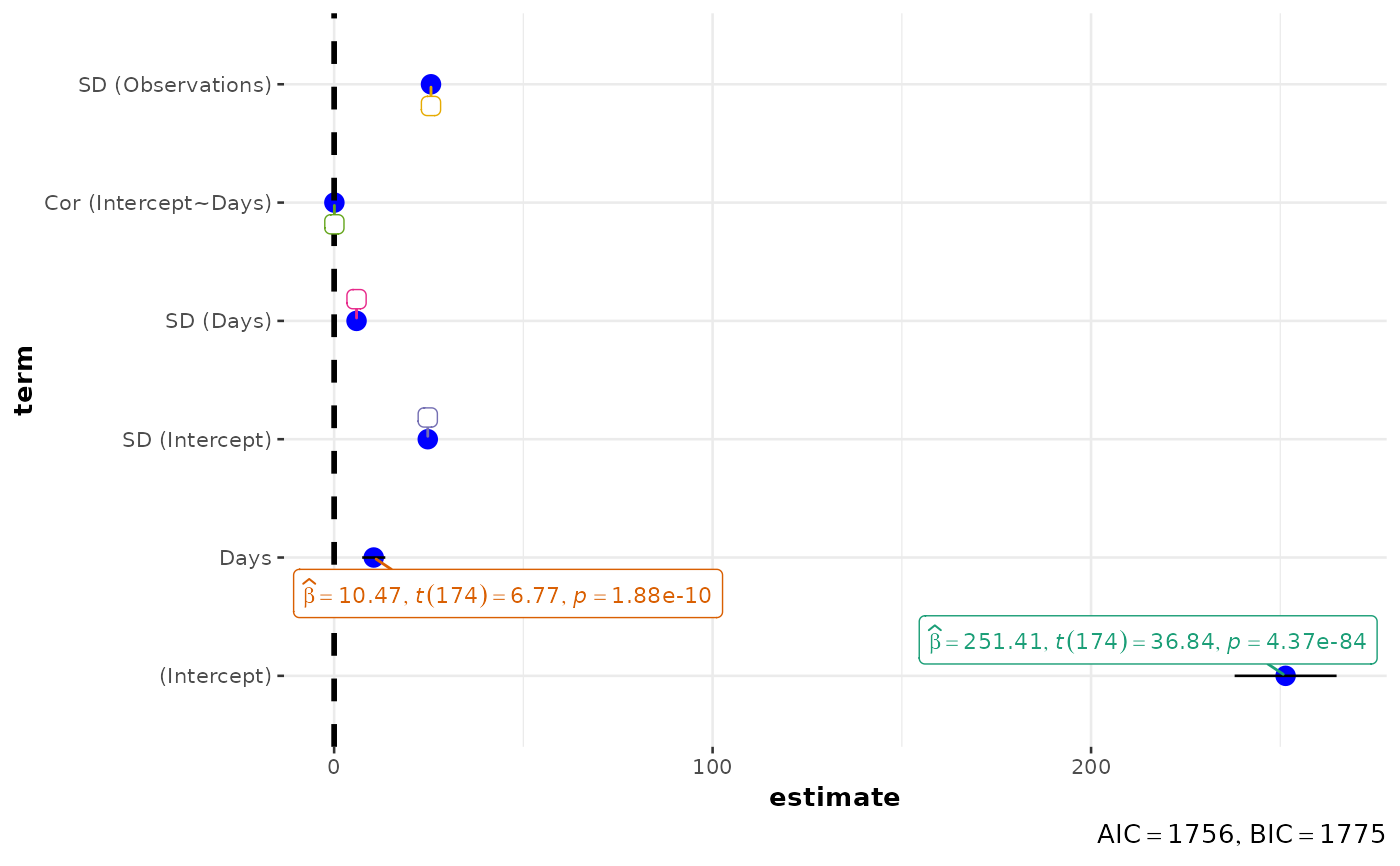 ggcoefstats(lmer(Reaction ~ Days + (Days | Subject), sleepstudy), effects = "fixed")