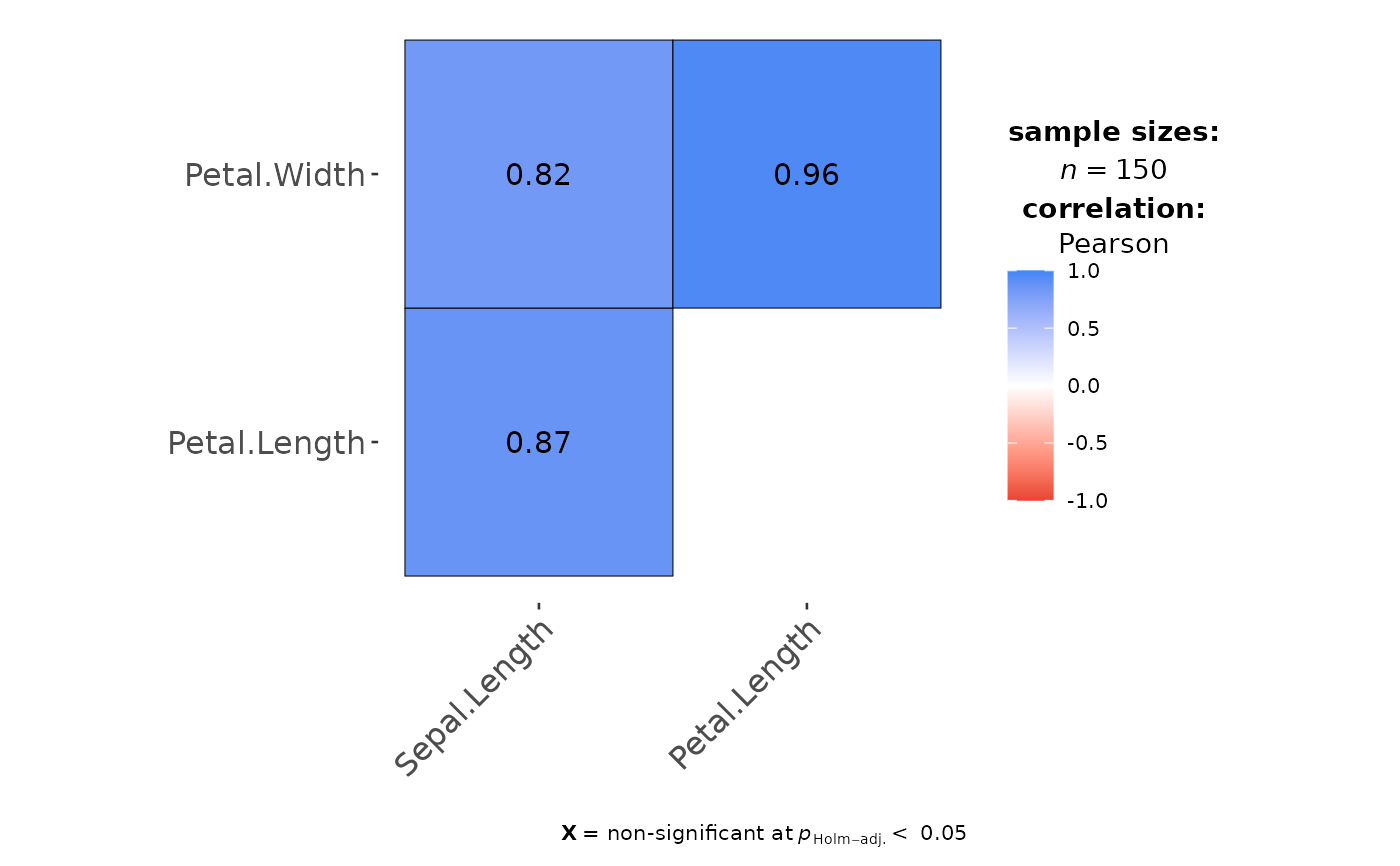 ggcorrmat(iris, cor.vars = c(Sepal.Length, Petal.Length, Petal.Width))