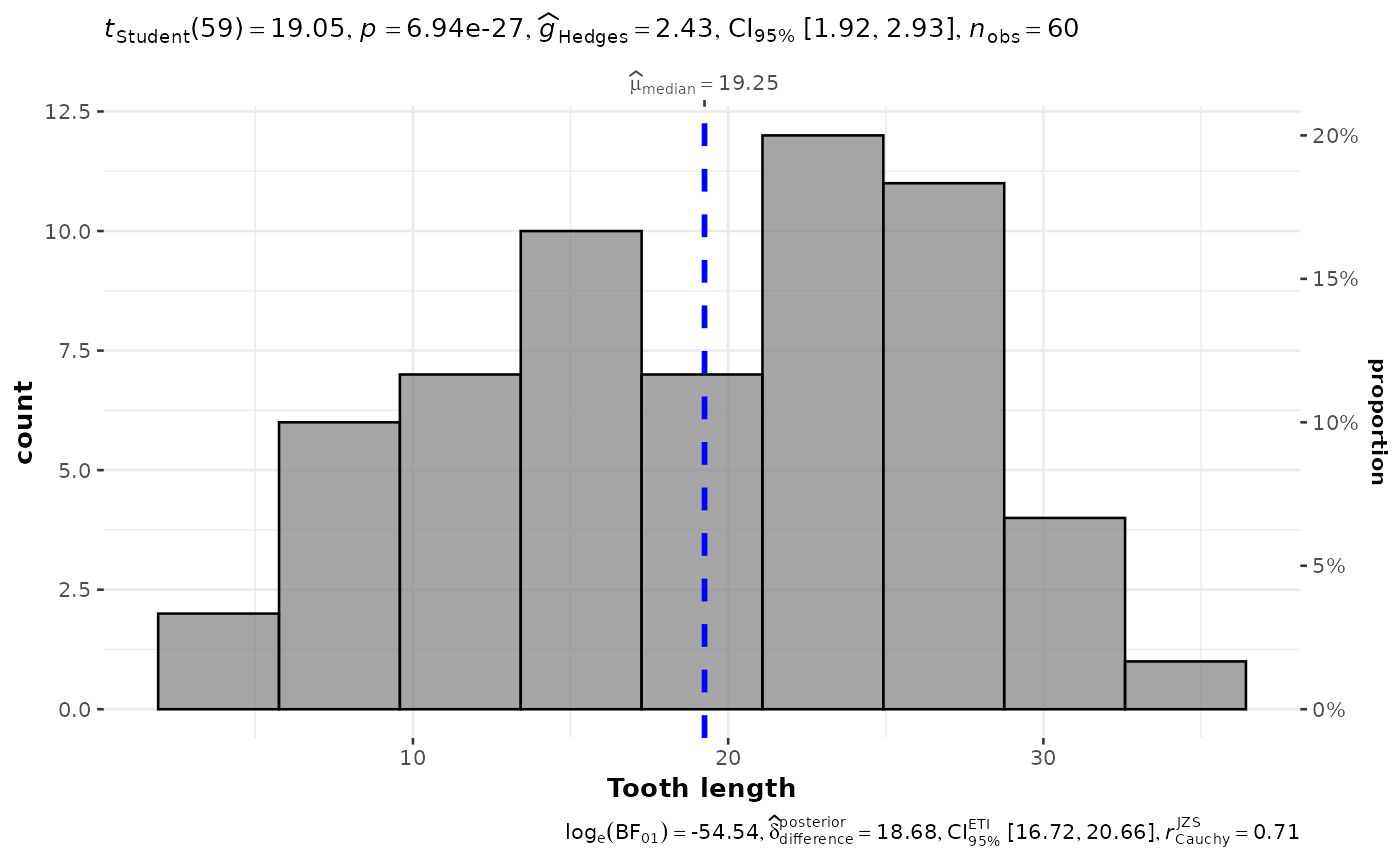 Histogram with statistical details from one-sample test included in the plot as a subtitle.