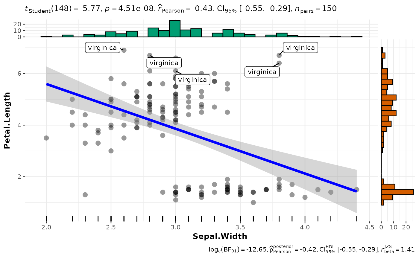 #> 1 Sepal.Width Petal.Length Bayesian Pearson correlation -0.422 0.95