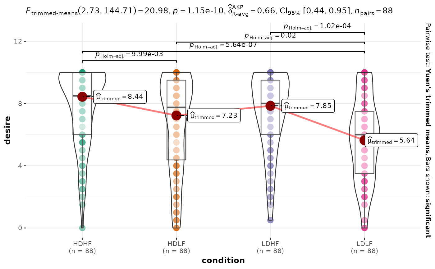 | Robust | Yuen's trimmed means test | Yes | WRS2::rmmcp() |